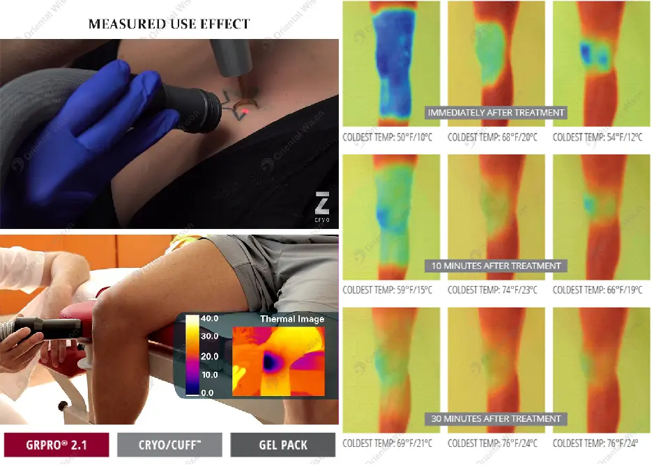 接触冷却、クライゲーゲンスプレー、アイスパックなどの他の冷却方法とは異なり、クライオ冷却機は皮膚の温度をより速く低下させ、皮膚の火傷のリスクが低く、治療時間全体を通して一定の投与量を保ちます。