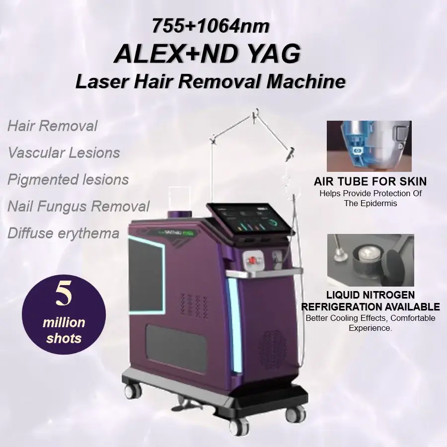 Alexwayレーザー脱毛機は、755NM+1064NMデュアル波長レーザーを使用して特定の皮膚色素を標的とするレーザーです。すべての肌の種類と肌の色の脱毛に適しています。