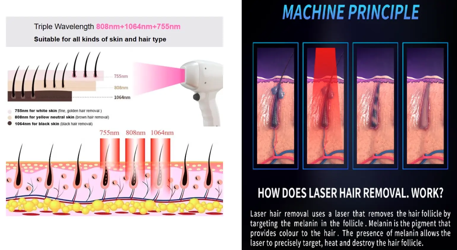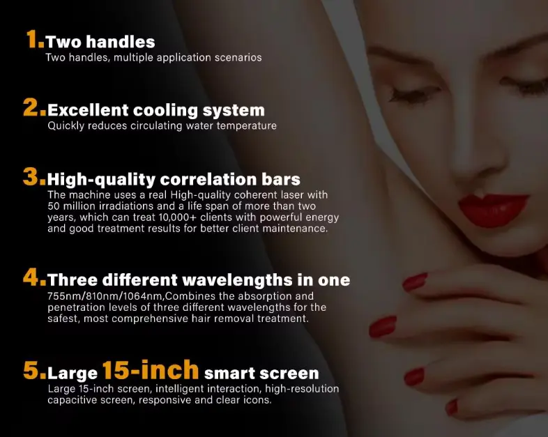 ダブルハンドル755 808 1064ダイオードレーザー脱毛は、脱毛用のシングルハンドルデバイスよりも大きな利点を提供します。 複数の波長を2つの交換可能なハンドルに統合することにより、これらのシステムは、多様な皮膚タイプ(FitzPatrick I-VI)と髪の色のためにテーラードトリートメントを提供します。 755nmは、細かく薄い毛(フェイシャルピーチファズなど)を効果的にターゲットにし、808nm(ゴールドスタンダード)はほとんどのボディエリアで粗い黒髪を扱います。 1064nmは、メラニンの吸収の減少とともに深く浸透し、暗い皮膚トーンまたは血管領域を安全に処理します。デュアルハンドルにより、セッション中に波長をより速く切り替えることができ、混合髪の種類(フェイス +脚など)の効率を最適化できます。さらに、デュアルシステムは、多くの場合、ハンドルあたりの独立した冷却またはエネルギー設定を備えており、快適さと精度を高めます。クリニックは汎用性の恩恵を受けます。1つのデバイスは、複数の単一波長マシンを置き換えます。患者の転帰を改善しながら、コストとスペースを削減します。開業医にとって、この柔軟性は、治療がよりパーソナライズされ、時間効率が良くなるため、患者のスループットと満足度が高いことを意味します。
