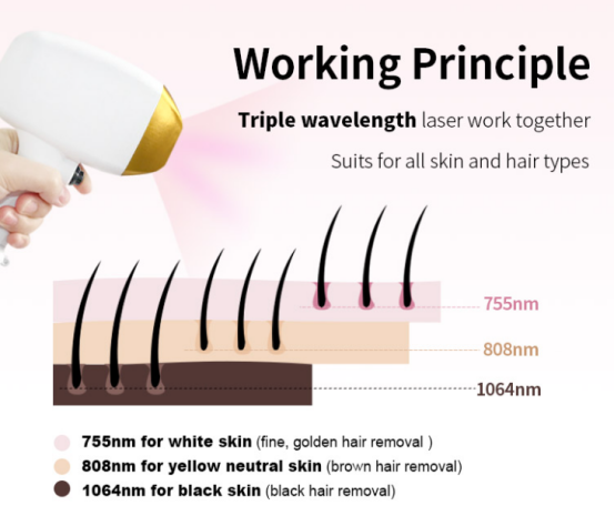 従来のレーザー脱毛は通常、単一の波長レーザーを使用します。異なるレーザー波長は、髪の深さと皮膚色素に対して吸収能力が異なるため、単一の波長レーザーは、すべての髪と肌の種類、755nmの波長に最適な効果をもたらさない可能性があります。