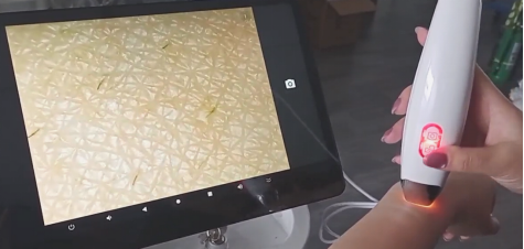 脱毛後、髪は非常に細かく柔らかくなり、成長を止めます。これは、毛包が損傷している兆候です。 1平方センチメートルの領域を丸で囲み、スキン分析ハンドルを使用して詳細を観察できます。